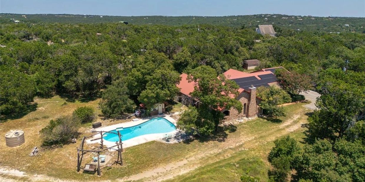 Discover a rare 10-acre gem in the peaceful Bear Creek Oaks, offering a blend of rustic charm and stylish updates. This unique property features a 3,457 sqft. main residence with inviting open spaces, exposed brick, and graceful arches, perfect for family gatherings or quiet retreats. Enjoy the independent casita, ideal for guests or in-law quarters, and a large swimming pool for relaxation. The property also includes a fully furnished, hand-crafted cabin currently used as a short-term rental, a 20-foot yurt, and multiple studio spaces ideal for creative work or personal retreat. Sustainability features include a 40,000-gallon rain collection system, well access, and solar panels. With easy permitting and ample land, this property offers endless possibilities for tranquil living, all while being surrounded by the beauty of Texas Hill Country. Perfectly positioned with convenient access to Austin and Dripping Springs, this retreat invites you to experience a lifestyle where rustic elegance meets modern comfort.